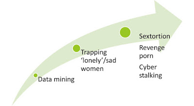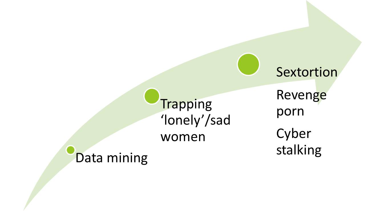 But still then, internet is not safe for women.  The Pollachi case proved it again.  Pollachi is the second largest town in Coimbatore district in Tamil Nadu.  This place is famous for its world famous jaggery  market and beautiful lush green agricultural fields. One would actually not imagine that this can be a center for news on cyber crimes against women, but it has now surfaced because of a brave young woman who had lodged a complaint against  the  smart gang of men who had been “enjoying” sex by way of connecting with women through fake profiles (mostly of women), grooming them to enter into chats and sharing more details, turning the chats into typical sex chats and then alluring them to come and meet in person. In my book Cyber crimes against women in India (coauthored with  prof(Dr) Jaishankar, Halder D., & Jaishankar K. (November 2016). Cyber Crime against Women in India. New Delhi: SAGE. ISBN: 978-93-859857-7-5.) I had discussed about such kinds of grooming and consequent victimization of women and this can be shown through the flow chart as below: